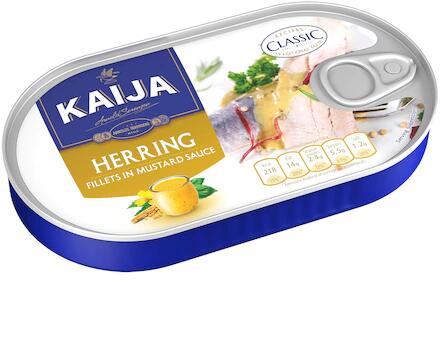 KAIJA hering filé mustáros olajban, 170 gÖsszetevők:60,0 % BALTI HERING (CLUPEA HARENGUS MEMBRAS), ivóvíz, MUSTÁRKÉSZÍTMÉNY [ivóvíz, 1,7 % MUSTÁR POR], cukor, repceolaj, étkezési só, sűrítõanyag (kukorica keményítõ), sűrítõanyag (karobpor), sűrítõanyag (guar gumi), sűrítõanyag (E466 (karboximetil-cellulóz)), savanyúságot szabályzó anyag (ecetsav), Worchester szósz [ivóvíz, malátacukor (maltóz), cukor, FŰSZEREK ÉS AROMA (SZÓJÁT TARTALMAZ), színezék (E150d (Szulfitos-ammóniás karamell))], fűszerek, paprika kivonat